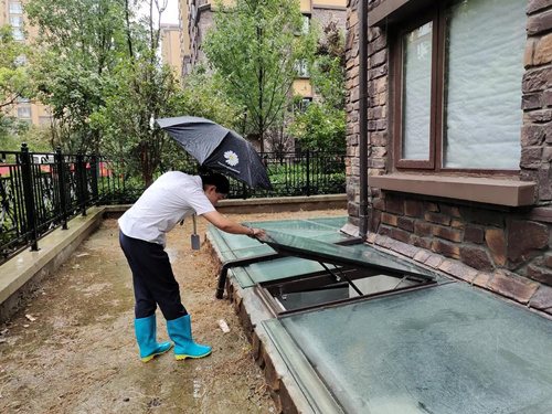 虽然没有暴雨来袭,但滴答的小雨一直下不停,警惕之心时刻悬挂心间,宁可白忙活一场,也不放过一丝漏洞,物业人员冒雨巡查园区各个排水点、楼顶、物业核心区域各个水电室、及时清理堵塞地漏、封堵单元门口,确保各项工作万无一失。